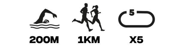 Le format comprend 200 m de natation suivis de 1 km de course à pied, à répéter jusqu’à 5 fois.