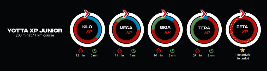 Le concept de la YOTTA XP, est de compléter un maximum de boucles en respectant le cut-off dégressif ! On t’explique, tu dois faire 4 min de moins par boucle mais le départ reste fixe. Tu dois donc être de plus en plus rapide, mais tu as de plus en plus de temps de pause entre chaque boucle. Pour tous les formats le départ se fera en mass start. Et pour le départ de la XP S, les femmes auront une arche qui leur sera “dédiée”. Le départ de la 5 ème boucle est en poursuite. Chaque athlète part en fonction de son classement. Le but étant de rattraper les premiers !