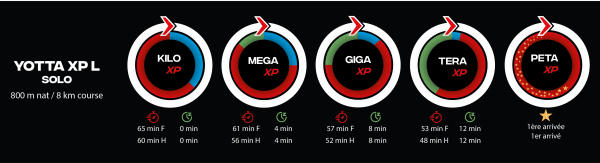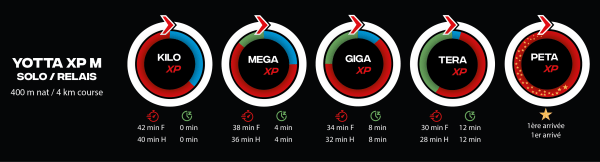 Le concept de la YOTTA XP, est de compléter un maximum de boucles en respectant le cut-off dégressif ! On t’explique, tu dois faire 4 min de moins par boucle mais le départ reste fixe. Tu dois donc être de plus en plus rapide, mais tu as de plus en plus de temps de pause entre chaque boucle. Pour tous les formats le départ se fera en mass start. Et pour le départ de la XP S, les femmes auront une arche qui leur sera “dédiée”. Le départ de la 5 ème boucle est en poursuite. Chaque athlète part en fonction de son classement. Le but étant de rattraper les premiers !